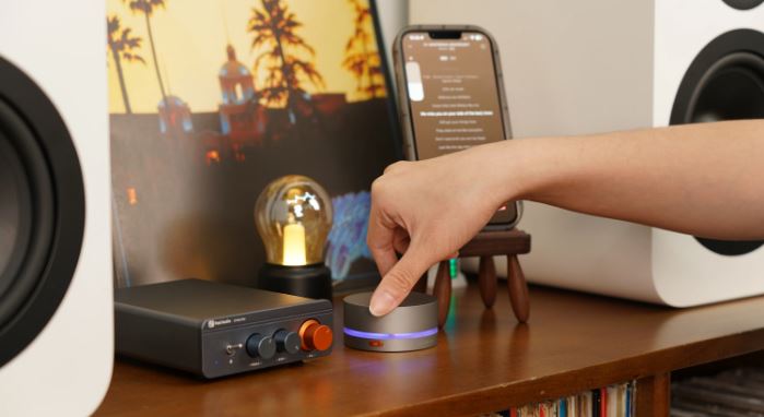 Everything about the VOL20 feels premium. It is heavy for its size and you can feel it is metal and not plastic and for me who is a tube lover who believes in steel & glass being everlasting beauty, I absolutely love the build quality. I will refer to vintage audio equipment again and when you the VOL20 knob it feels like adjusting volume on one of those vintage receivers. There is a ring light at the base of the VOL20 that when it glows it almost like the top ring light that goes on when you talk to your smart speaker. You can set the light to off if color lights annoy you or you can set it to switch between colors like a rainbow. You can also choose a specific color and me being a lover of purple I chose the purple ambient light color. Purple to me always means tranquility.